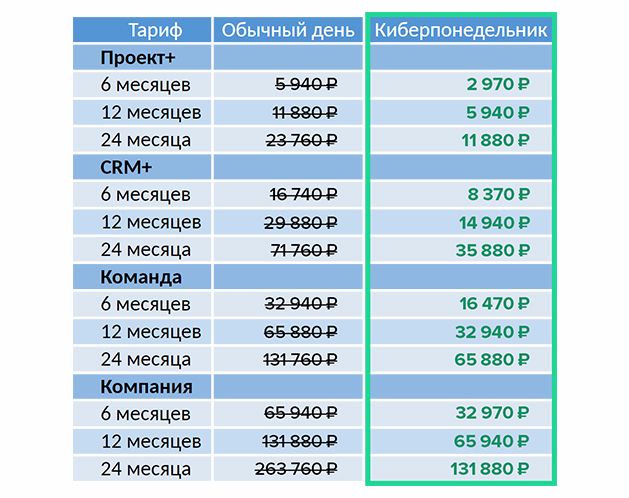 - Акция распространяется на ВСЕ облачные тарифы (Проект+, CRM+, Розница.СRM, Команда, Компания).