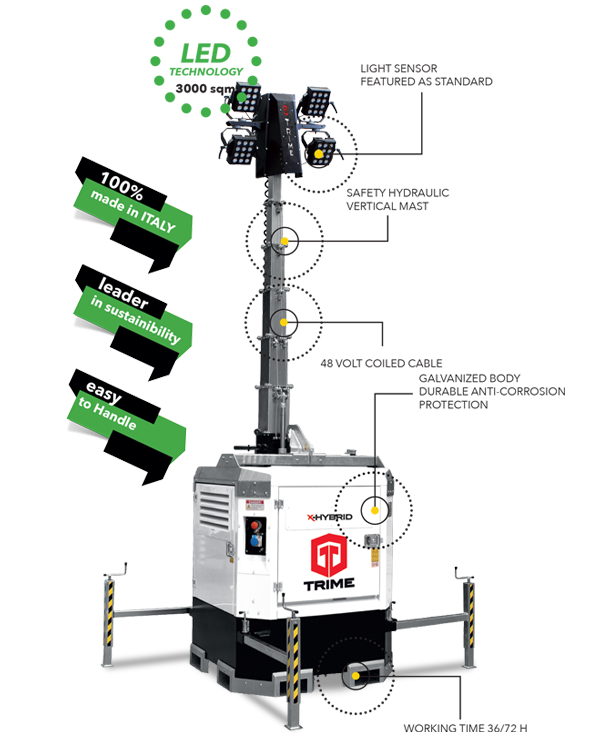 Инженеры TRIME знают, что рынку нужна осветительная вышка, которая была бы прочной, долговечной и безопасной. X-HIBRID был создан исходя из этих характеристик. Это лучшее решение для ваших нужд и гарантирует 3000 кв.м освещенной площади. 20 единиц могут быть загружены на стандартный грузовик. Ко всему этому Трайм добавили технологию, которая обеспечивает максимальную эффективность и надежность топлива.