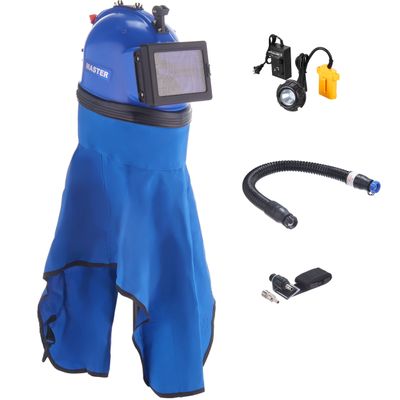 Шлем для пескоструйных работ оснащен многослойными защитными стеклами, сменным воротником из хлопка на молнии.
